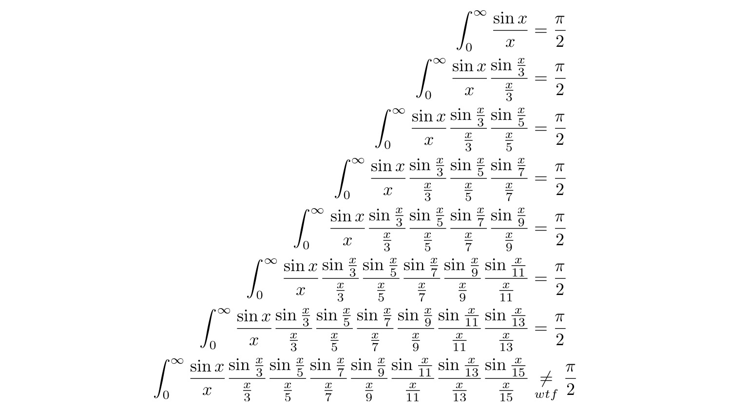 Integrating sin(x)/x from 0 to Inf yields π/2. Same with sin(x)/x * sin(x/3)/(x/3) and sin(x)/x * sin(x/3)/(x/3) * sin(x/5)/(x/5). Continuing the pattern, the first 7 terms in this sequence all have the value π/2. However, sin(x)/x * ... * sin(x/15)/(x/15) breaks the pattern. Why?