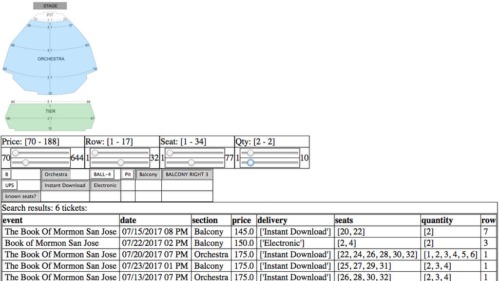 The search capability of the StubHub online ticket marketplace sucks. So I used the browsergui browser-based GUI framework and BeautifulSoup to download, parse, and display a search interface that allows users to search across multiple events for specific sections, rows, and seats.