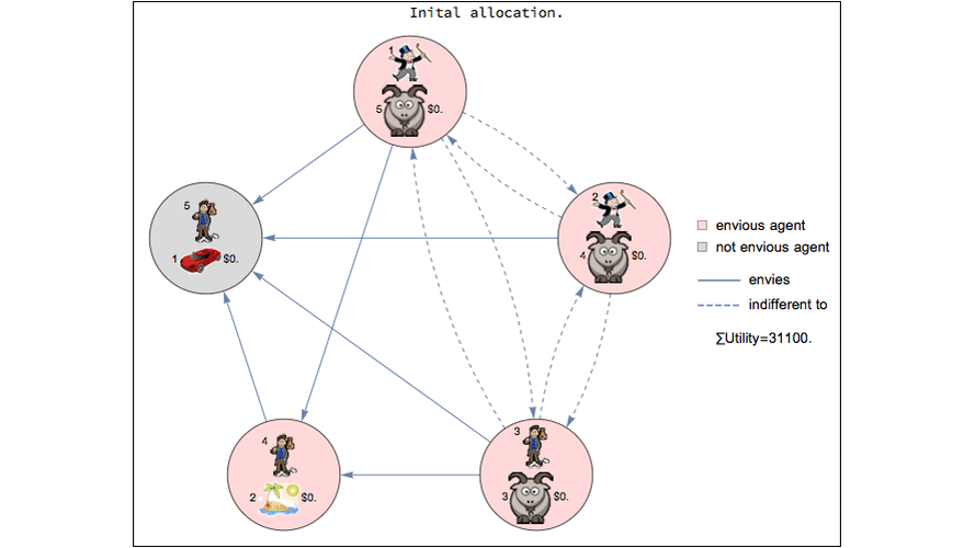 This code illustrates an algorithm from an Dutch economics paper about object allocation. Consider the problem of allocating n objects to n people. Typically folks with crappy objects would envy the folks with desirable objects. But what if winners of the nice objects paid money to the folks who won the crappy objects? The paper presents an algorithm for figuring out how much money would need to be transferred so that no one envies anyone else.