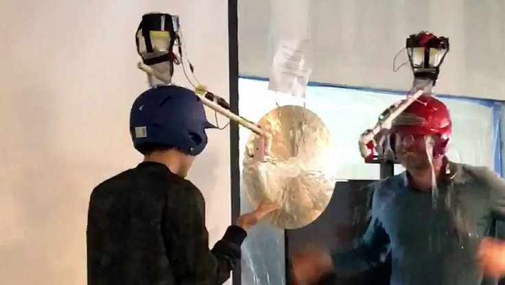 Take “stare-down” to the 21st century. Each player wears a helmet that watches the face of the wearer. When the wearer smiles, it pops a water balloon on their head. John and I developed this for Appfolio Hack Day in 2017.